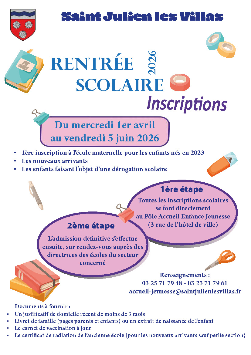 Bienvenue à Saint-Julien-les-Villas Facebook YouTube Instagram Votre navigateur ne supporte pas la vidéo. Dernières actualités Rentrée scolaire 2026 inscription Lire plus Chasse aux œufs 2026 Lire plus Multi-Accueil Les Petits LutinsPour les enfants de3 mois à 3 ans Lire plus Aménagement des travaux sur l’avenue de la Gare Lire plus Prochains évènements Avr 3 20:30 à 23:00 Soirée jeux 🕹 Avr 4 4 avril- 09:00 à 5 avril- 18:00 Foire à tout par l’école des chats Avr 4 4 avril- 09:00 à 6 avril- 20:00 Tournois multi-chance tennis Avr 4 13:45 à 17:00 La randonnée des poulettes Avr 4 20:15 RSJH 🤾♂️ Avr 5 10:00 à 11:30 Chasse aux œufs 🥚 Avr 11 11 avril- 14:00 à 12 avril- 17:00 Soirée jeux 🕹 Voir le calendrier